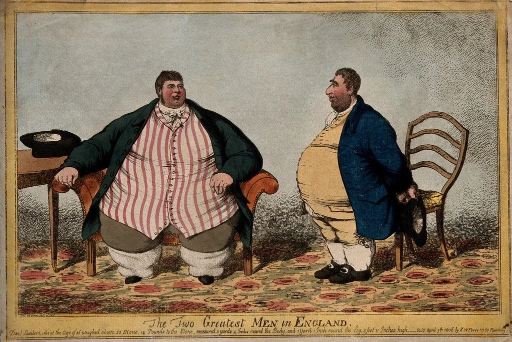 A humorous comparison between the obese Daniel Lambert and Charles James Fox, the politician. Colored etching by C. Williams, 1806.*